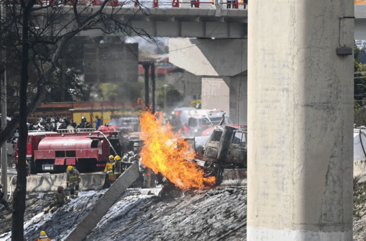 La explosión en el Puente La Concordia, en Iztapalapa, Ciudad de México, tras la volcadura de una pipa de gas,...