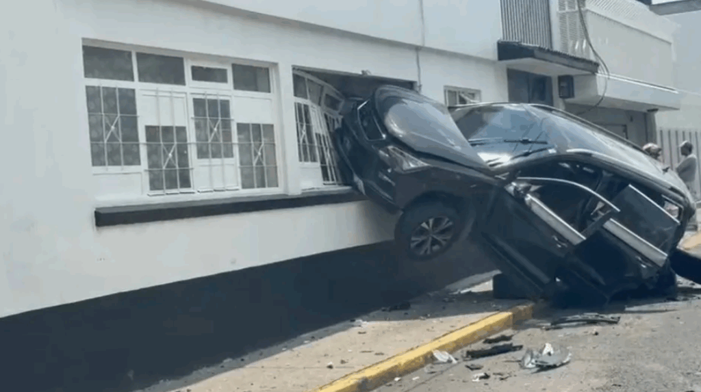 Testigos refieren que dos vehículos colisionaron en dicha intersección, lo que provocó que la conductora de una camioneta con placas PXZ-093-E perdiera el control y se proyectara directamente contra la fachada de un domicilio.